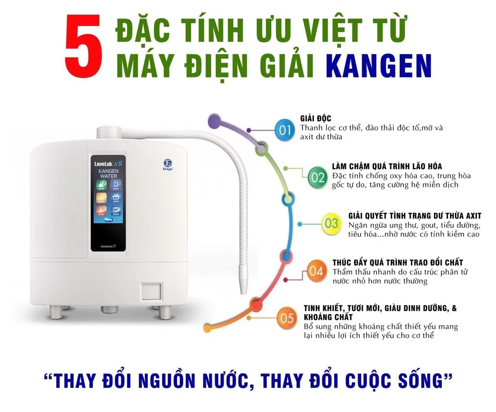 Nước Kangen Water® giàu tính kiềm tự nhiên và khoáng chất tự nhiên, cùng với hydrogen hoạt tính có tác dụng thanh lọc cơ thể, làm chậm quá trình lão hóa. Ngoài ra, máy còn tạo ra 4 loại nước quý khác: nước rửa rau, nước làm đẹp, nước khử khuẩn sát trùng và nước pha sữa cho em bé.