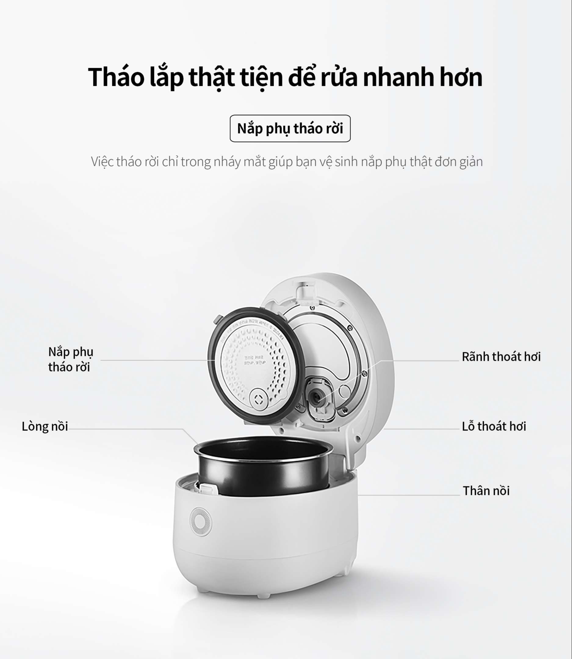 – Điều khiển cảm ứng - Dễ sử dụng: Thiết kế cảm ứng, thông minh giúp người dùng thao tác dễ dàng khi sử dụng. Cài đặt sẵn các chế độ nấu rất tiện dụng giúp người dùng tiết kiệm tối đa thời gian nấu cơm cho gia đình.