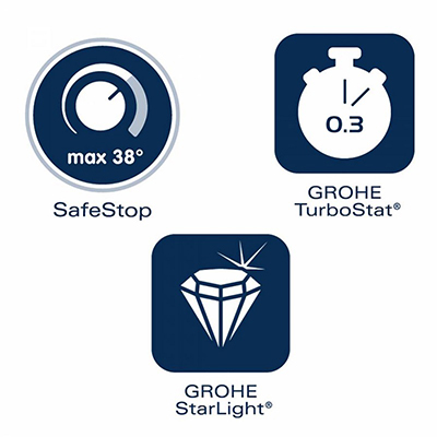 GROHE StarLight: Dễ dàng chăm sóc nhờ lớp mạ crôm bền bỉ. Chỉ cần lau vòi bằng vải khô - bề mặt đặc biệt mịn màng đảm bảo bề mặt luôn sáng bóng và cũng không lo trầy xước. Đối với bạn, điều này có nghĩa là bạn tiết kiệm thời gian với việc nhà và luôn có Bộ sen như mới.