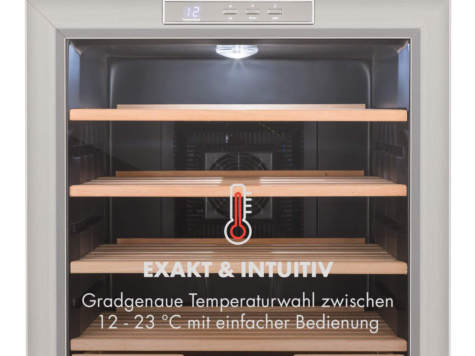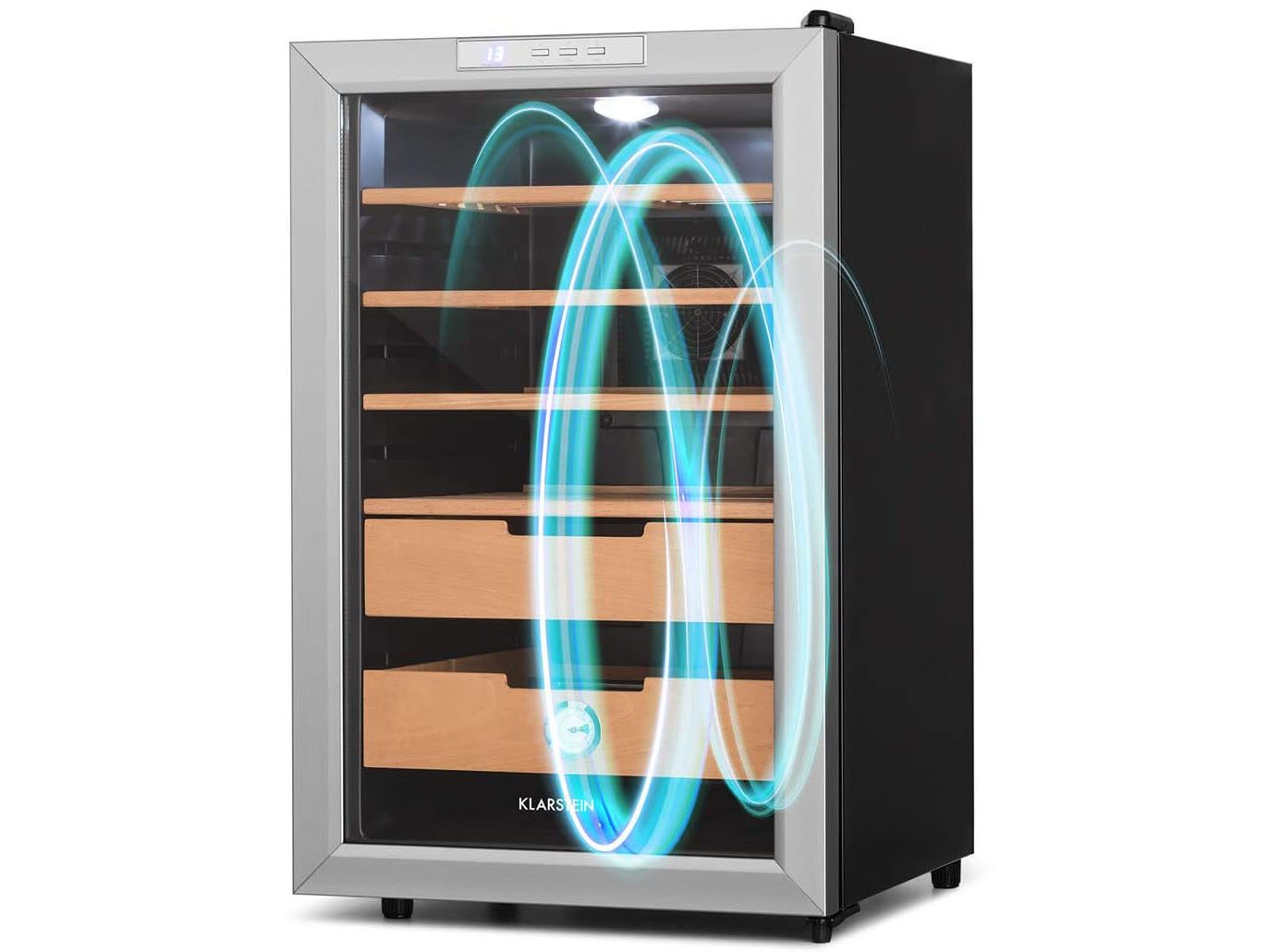 Tủ cigar Klarstein được thiết kế trang nhã với khung chắc chắn bằng thép không rỉ, cửa kính hai lớp với 4 ngăn kệ và 2 ngăn kéo bằng gỗ sồi Tây ban nha. Thiết kế nhỏ gọn và sang trọng tiện bày gia đình, quán bar hoặc câu lạc bộ.