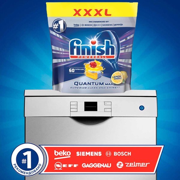 - Với kết cấu enzyme đặc biệt dạng viên mềm chỉ có ở viên rửa bát Finish Quantum Max Lemon với 2 lớp riêng biệt mà thống nhất và viên Powerball (tích hợp công dụng ưu việt của muối, bột tẩy rửa và nước làm bóng chuyên dụng) tạo nên một sức mạnh vô hạn cắt xuyên qua dầu mỡ, dư lượng thực phẩm, đánh bật mọi vết bẩn, tăng cường độ sáng bóng và bảo vệ bát đĩa tốt hơn.
